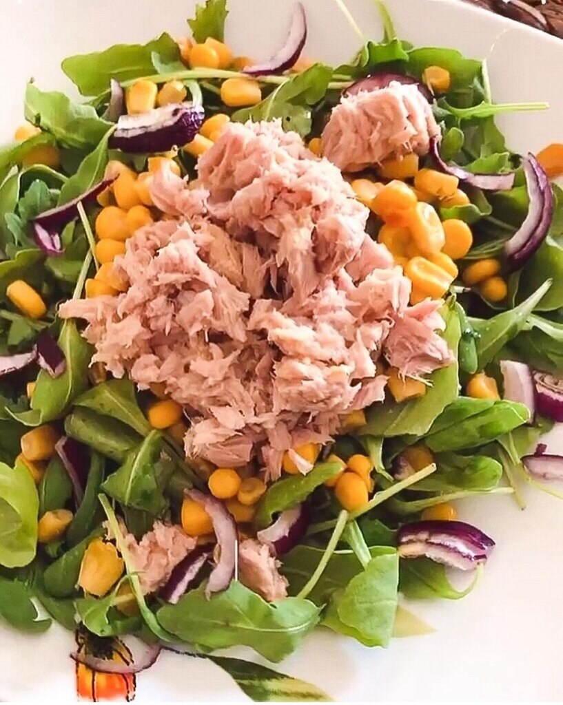Escurrimos el atún al natural, lo colocamos sobre una cama de lechuga y añadimos maíz y cebolla de Tropea finamente cortada. No olvidemos sal y aceite de oliva virgen extra.