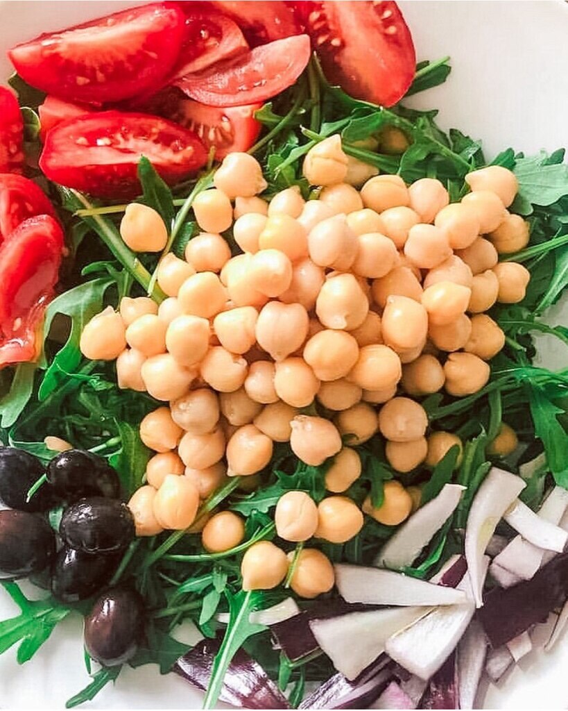 Prueba a poner en un bowl los legumbres ya cocidos, rúcula, aceitunas negras, cebolla de Tropea en rodajas y tomatitos.