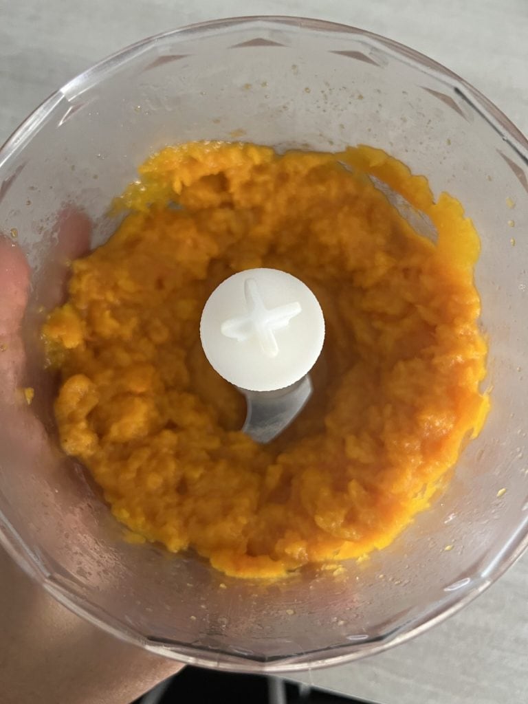 La corto en trozos y la pongo en una batidora. Dejo que trabaje hasta que la calabaza esté bien triturada. La pulpa de calabaza ahora está lista.