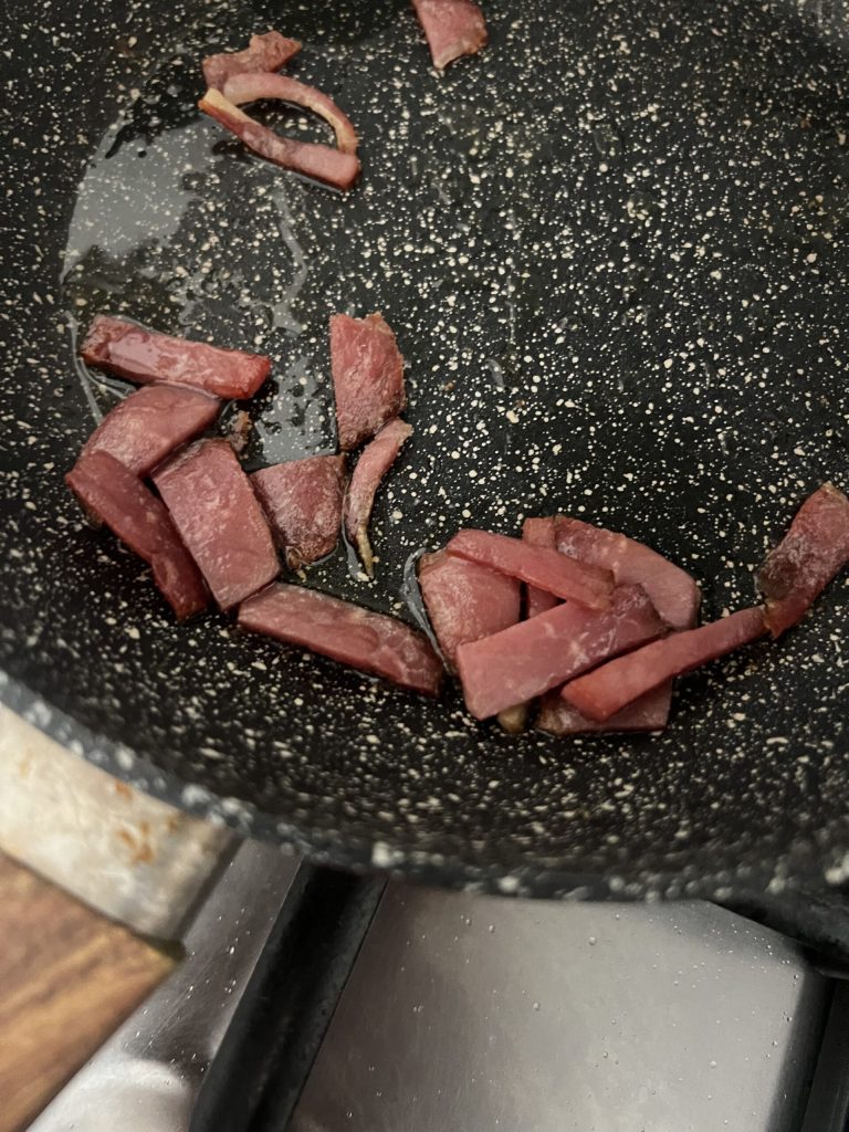 Tomamos el speck y lo cortamos en tiras finas. Lo salteamos unos minutos en una sartén (sin aceite) caliente hasta que esté crujiente.