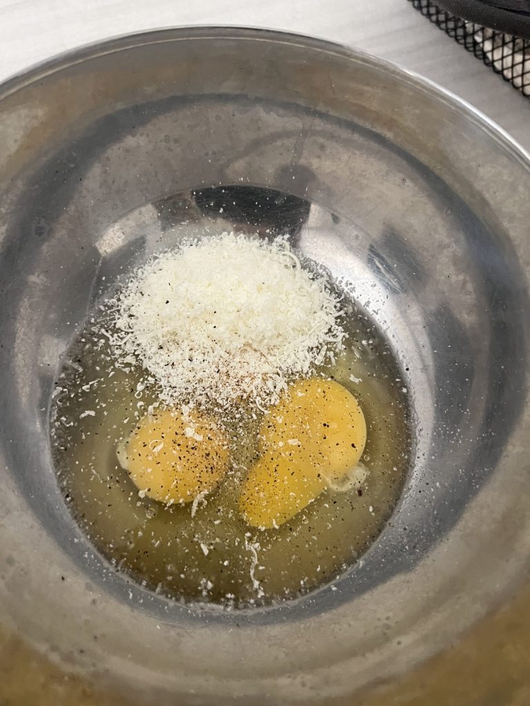 Prepararemos este plato en el tiempo de cocción de la pasta. Ponemos al fuego una olla con agua a hervir. Mientras tanto, en un bol ponemos los huevos, el parmesano, la sal y la pimienta y mezclamos enérgicamente con un tenedor o una batidora, añadiendo un cucharón de agua de cocción.