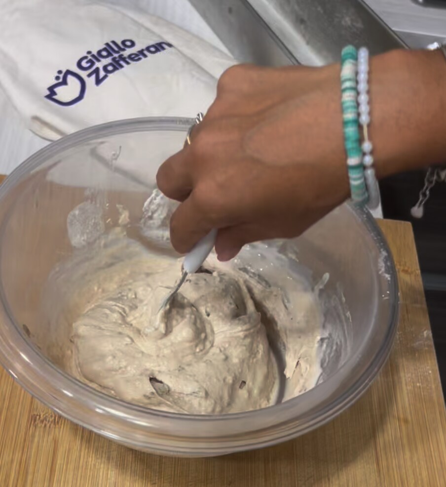 • Primero dejamos que el helado se ablande bien a temperatura ambiente, luego lo vertemos en un bol. Añadimos la levadura a la harina y la agregamos al bol con el helado.