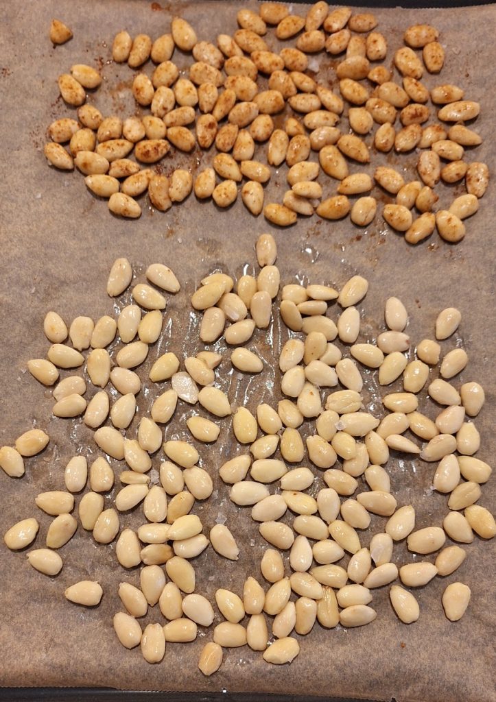 Añade en el cuenco con las almendras restantes dos cucharaditas de pimentón (o otras especias al gusto), mezcla y viértelas en la bandeja manteniéndolas separadas de las clásicas.
