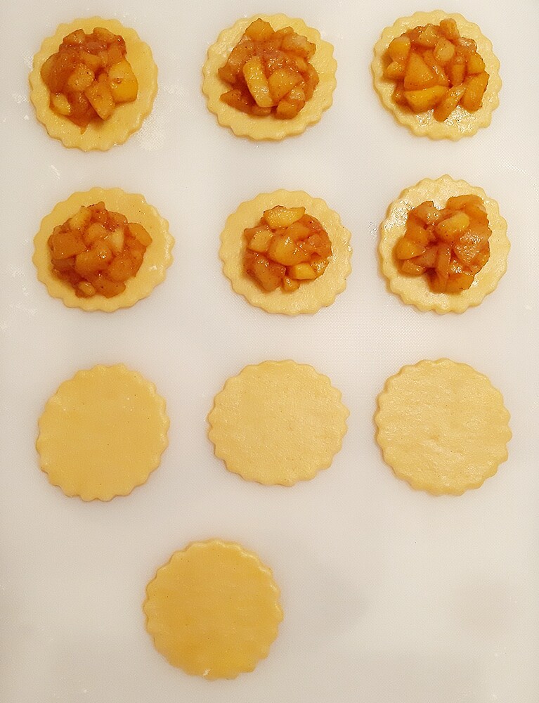 Rellena 12 discos con una cucharadita abundante de manzanas y cúbrelos con los otros círculos de pasta frolla presionando a lo largo de los bordes para sellarlos bien.