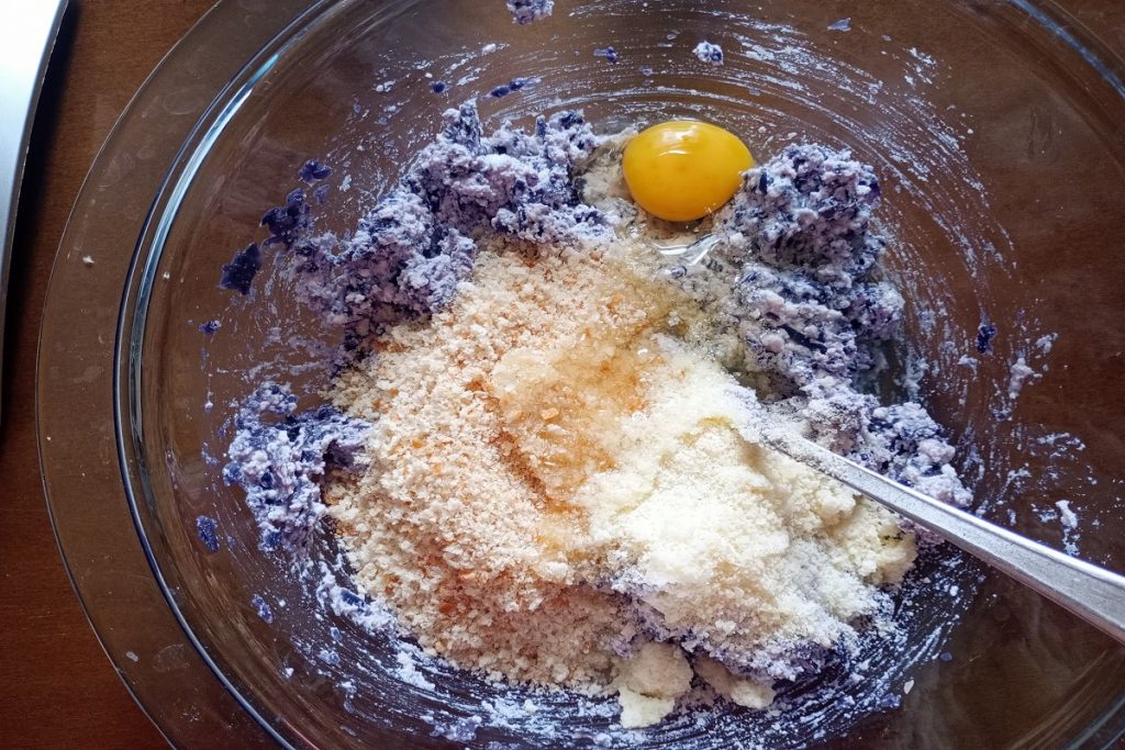 Incorporamos el resto de los ingredientes: miga de pan, parmesano, huevo, ajo en polvo y otro pellizco de sal.
