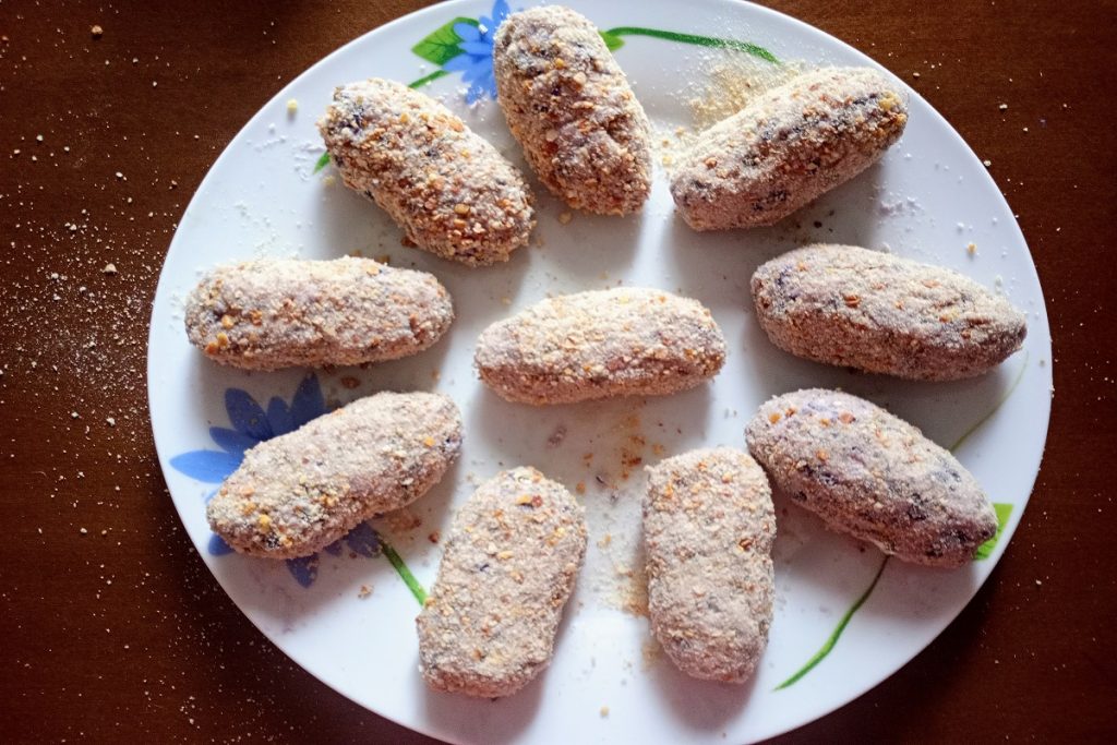 Damos forma a la masa creando albóndigas alargadas, las pasamos por el pan rallado.