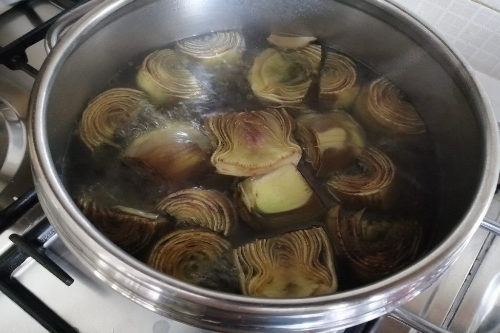 Ponemos las alcachofas en una olla con agua y las escaldamos durante 5 minutos.