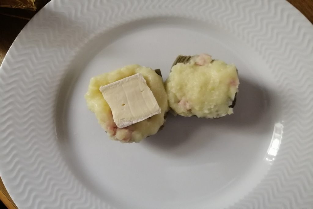 El relleno está compuesto por un puré de patata con dados de jamón cocido y un trocito de queso brie, pero podéis usar la imaginación según vuestros gustos personales.