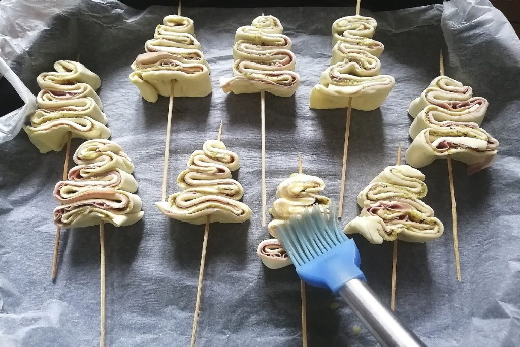Pinchamos los arbolitos con un palillo para brochetas, los colocamos en una bandeja cubierta con papel de horno y damos una pincelada con el huevo batido.
