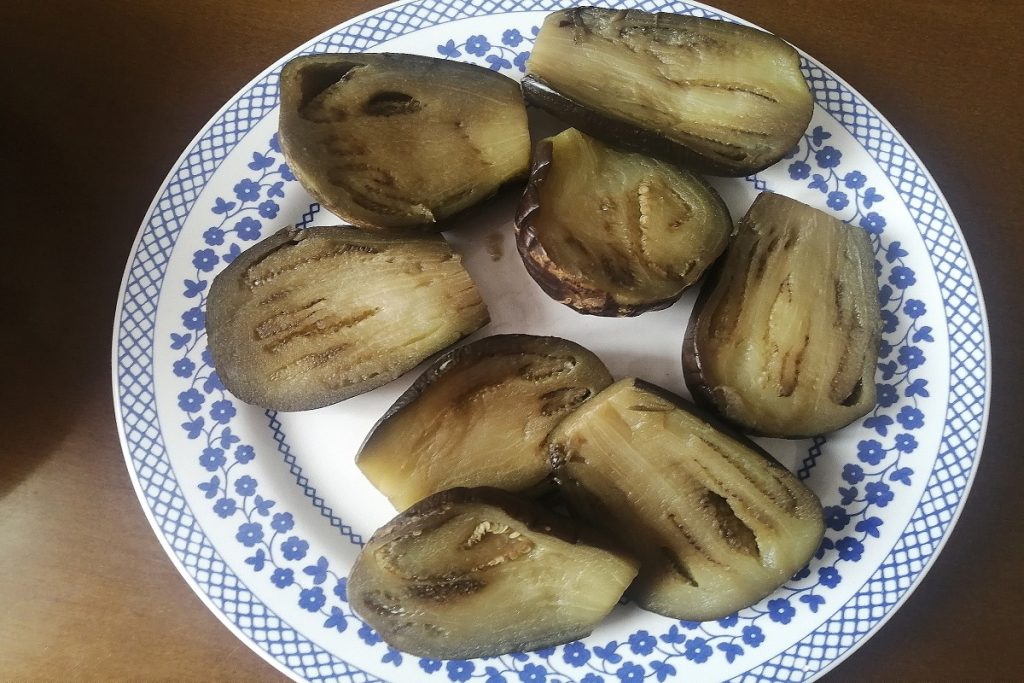 Lavamos, quitamos el pedúnculo de las berenjenas y las cortamos por la mitad. Las ponemos en una olla con agua y las escaldamos.