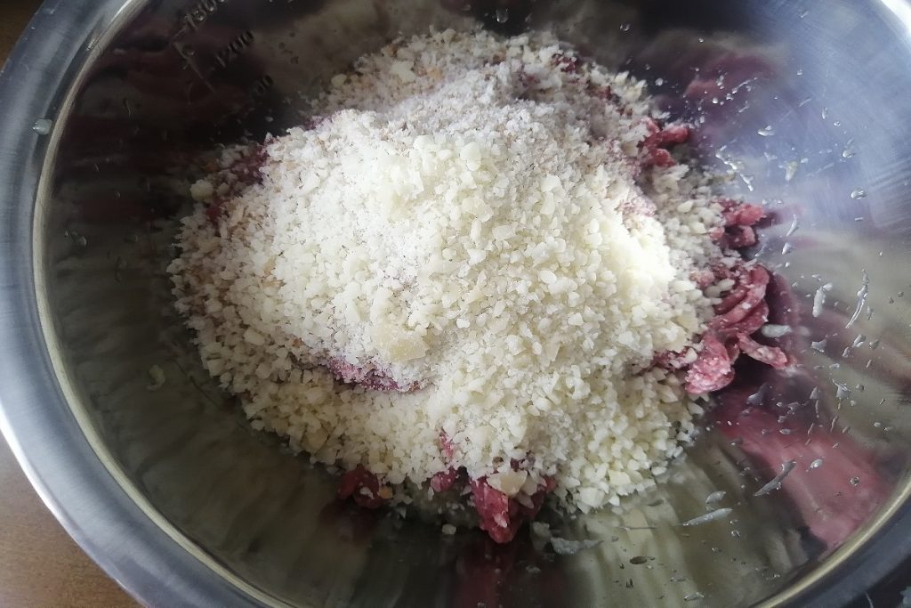 Añadimos a la pulpa de berenjenas la miga de pan, el queso grana rallado, la sal, el huevo, el perejil y el ajo.