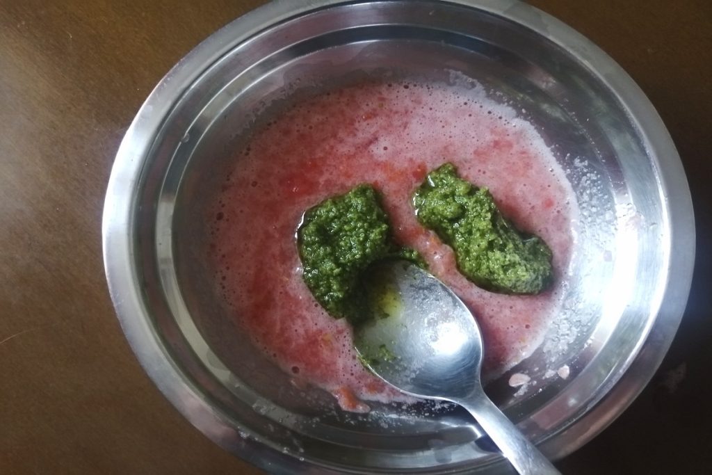 Vierte en la pulpa de tomate el pesto de albahaca y mezcla.
