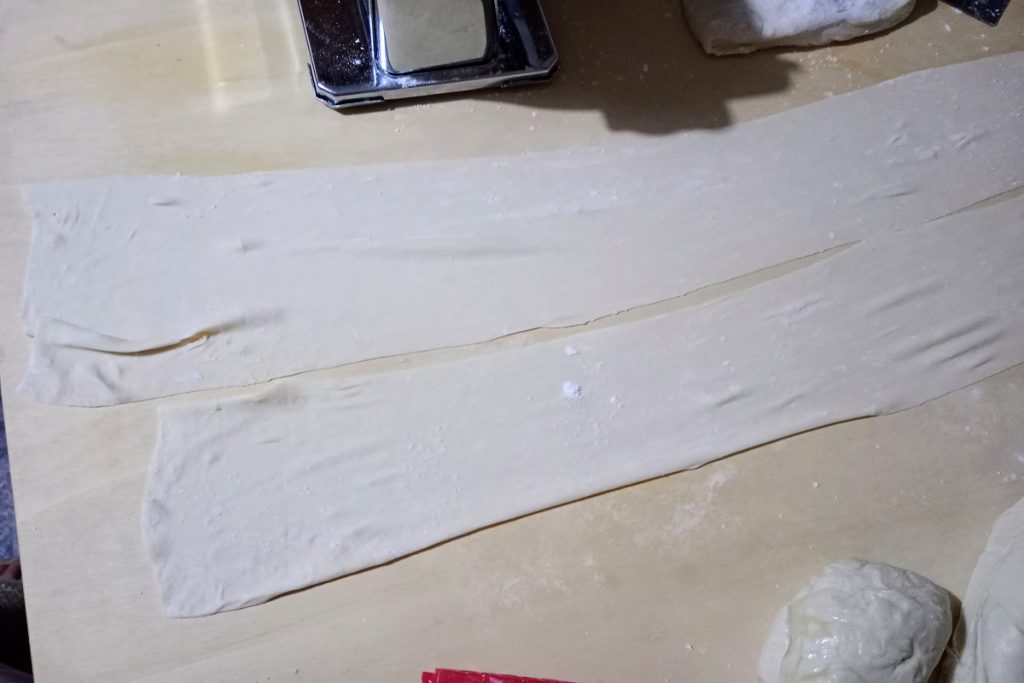 Con la máquina de pasta estirad láminas muy delgadas, espolvoreando con maicena.