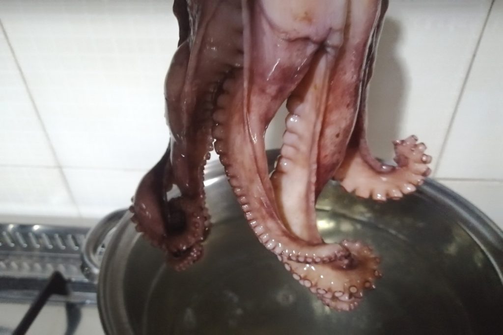 Cuando el agua empiece a hervir, coged el pulpo e introducid los tentáculos durante unos segundos y luego levantad.