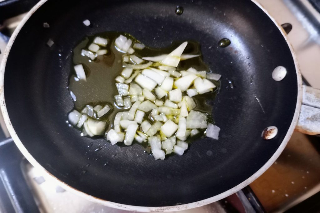 • En una sartén pequeña he vertido una cucharada de aceite y la cebolla finamente picada.