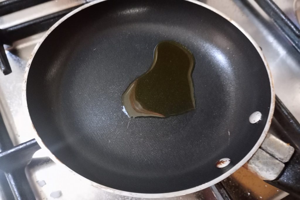 • En la sartén vertemos la otra cucharada de aceite y vertemos los huevos para cocinarlos.