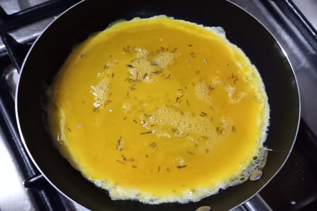 • Cascamos los huevos vertiéndolos en un bol, los salamos y condimentamos con cebollino, los batimos con un tenedor.