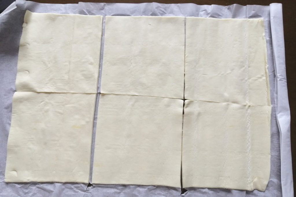 Cortamos la masa de hojaldre en 6 cuadrados y los colocamos en un molde para muffins formando cestitos.