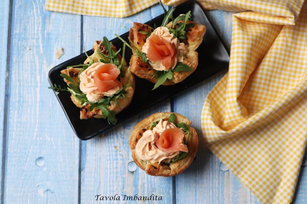 Los cestitos de hojaldre con salmón y rúcula son un excelente fingerfood para un apericena con amigos, naturalmente para acompañar con otras cositas sencillas y rápidas como los biscotitos salados, las costras de parmesano, y los palitos de polenta.