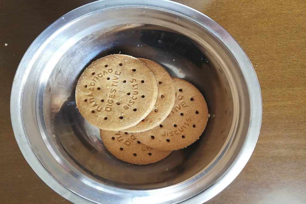 Colocamos las galletas Digestive en un bol y las trituramos con un mazo hasta reducirlas a polvo.