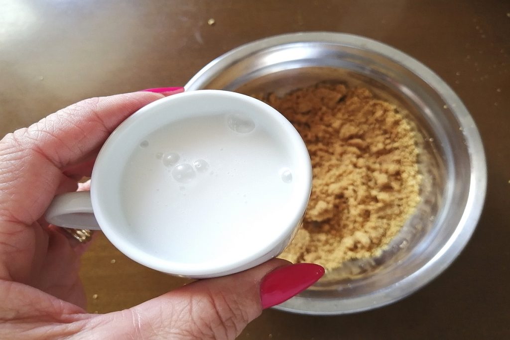 Vertemos la bebida vegetal sobre las galletas y mezclamos hasta obtener una masa.