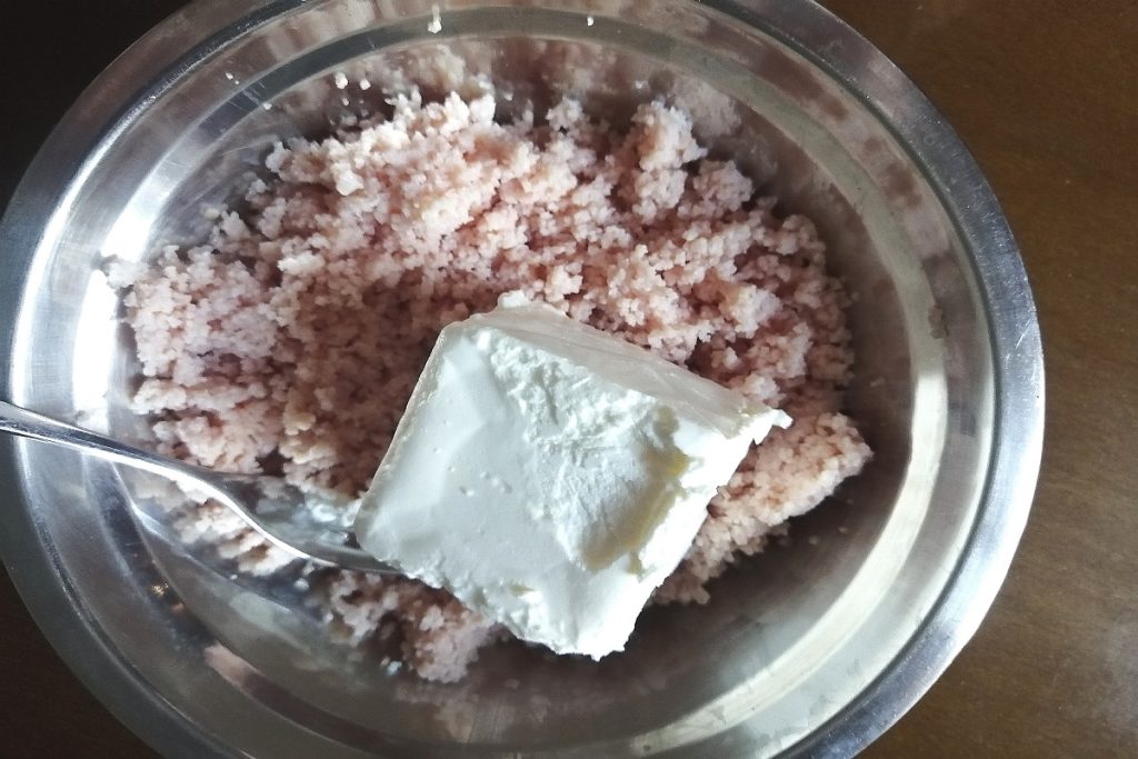 Batid el jamón cocido e incorporad la robiola, mezclad los dos ingredientes hasta obtener una crema homogénea.