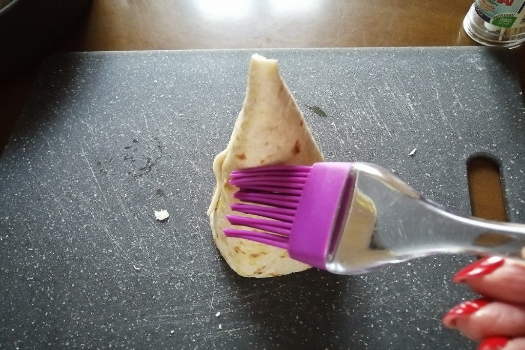 • Cortamos las piadinas por la mitad y las enrollamos formando un cono, cerramos con un palillo.