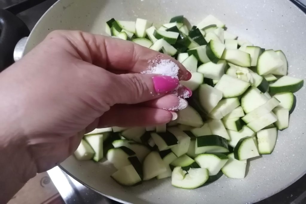 • Vertemos en la sartén los calabacines y condimentamos con sal, ajo, perejil y menta.