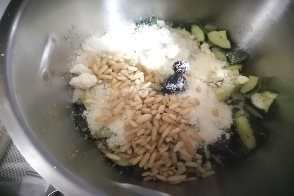 • Una vez cocidos, vertemos los calabacines en una batidora añadiendo el resto de los ingredientes: pecorino, grana y piñones. Trituramos bien todo.