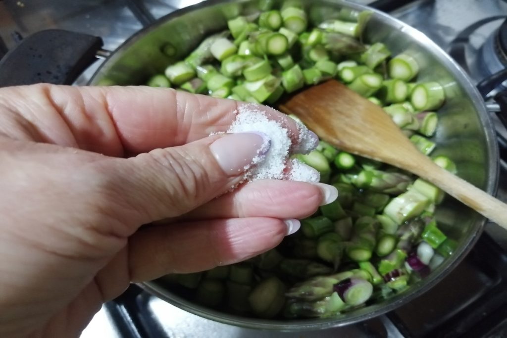 Sazonamos con sal y pimienta blanca, cubrimos con agua tibia y dejamos cocinar a fuego moderado hasta que los espárragos estén cocidos.