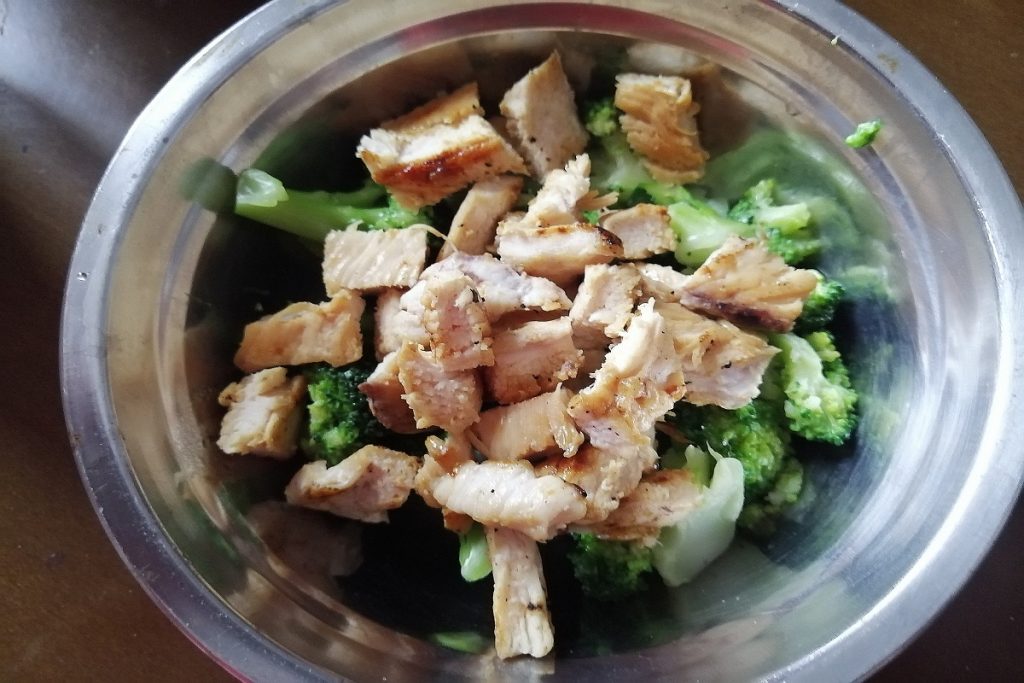 • Corta el pollo en trozos pequeños y mézclalo con el brócoli, condimenta con una cucharada de aceite de oliva virgen extra.