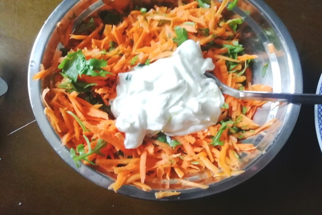 Para hacerla agradable al gusto basta con preparar mi receta con zanahorias cortadas en juliana y rúcula, todo aderezado con una salsita de yogur sabrosa que preparas en casa.