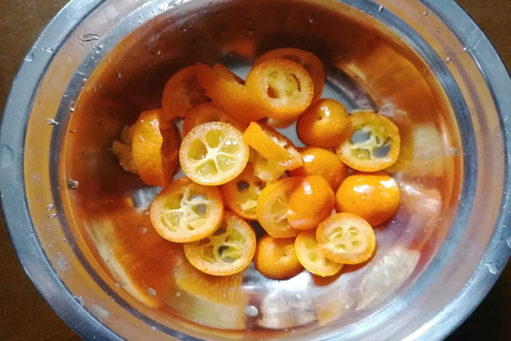 • Incorporamos los kumquats y añadimos el medio vaso de agua caliente para cocinar durante 6-7 minutos.
