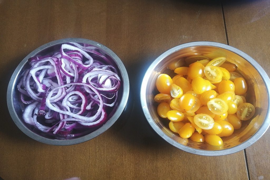 Lavamos los tomates cherry y los cortamos por la mitad.
