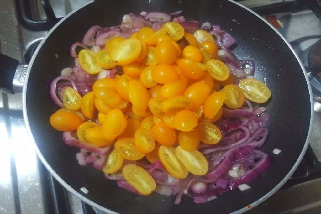 Añadimos los tomates cherry cortados y los dejamos cocinar durante 5 minutos, removiendo con frecuencia.