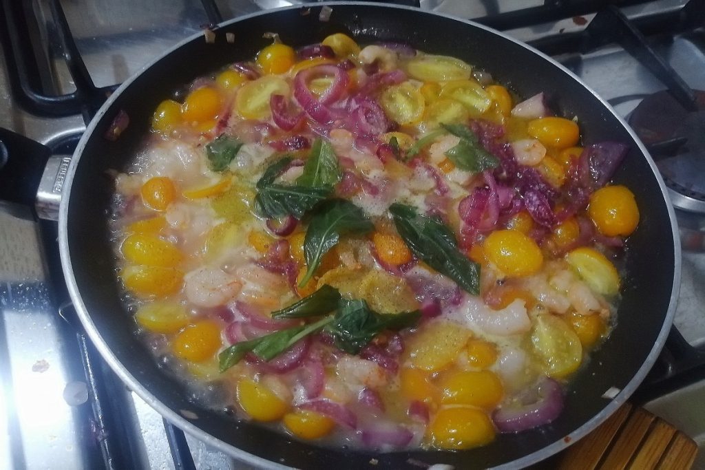 Los espaguetis con tomate cherry amarillo, cebolla de Tropea y gambas , armonioso en sus colores, el rojo de la cebolla que envuelve el amarillo de los tomates y el rosa de las gambas, ofrecen en cada bocado una explosión de sabores.