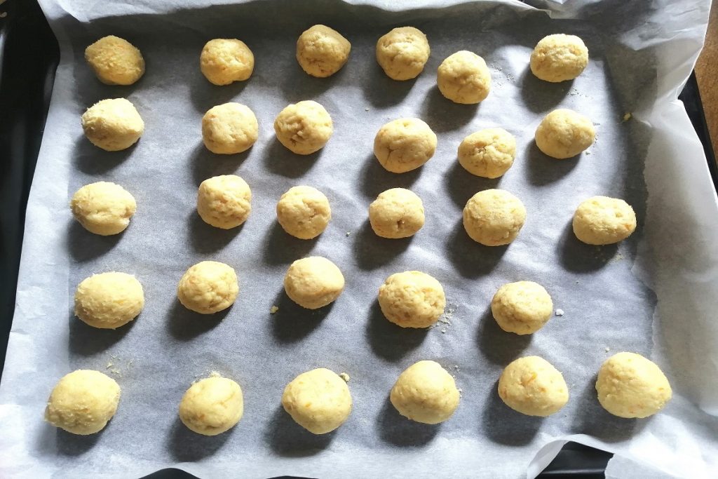 • Retomamos la masa y comenzamos a formar bolitas que vamos a colocar en la bandeja con papel de horno.