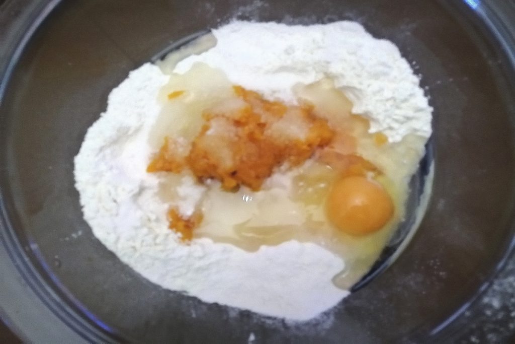 En un bol vertemos la harina mezclada con la levadura, la pulpa de calabaza.