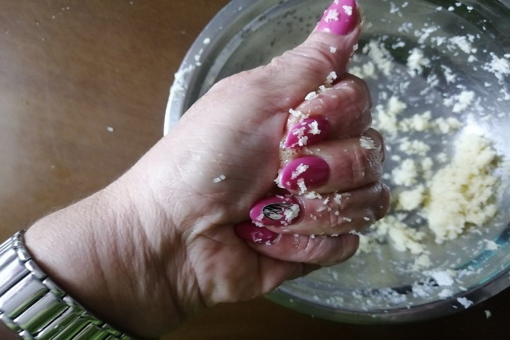 Después de amasar, obtendrás una masa pegajosa y desmenuzada. Toma una pequeña cantidad de la masa, apriétala en la palma de la mano para compactarla y forma una pequeña bolita.