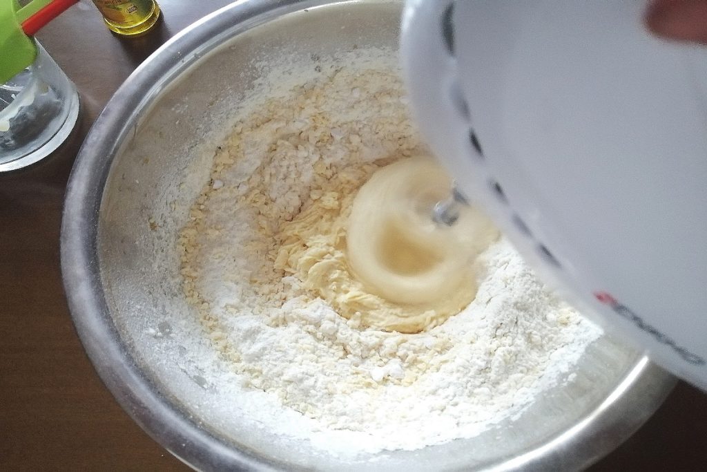 Cuando la masa esté consistente, seguimos amasando con una espátula.