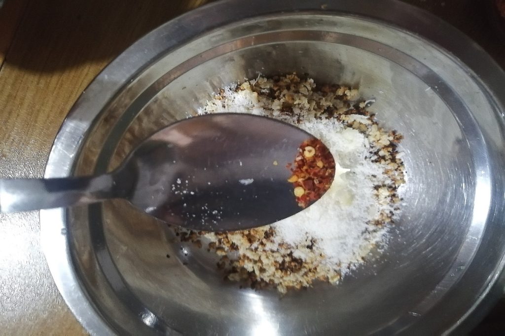 Añade una pizca de guindilla y el perejil, mezcla todo.