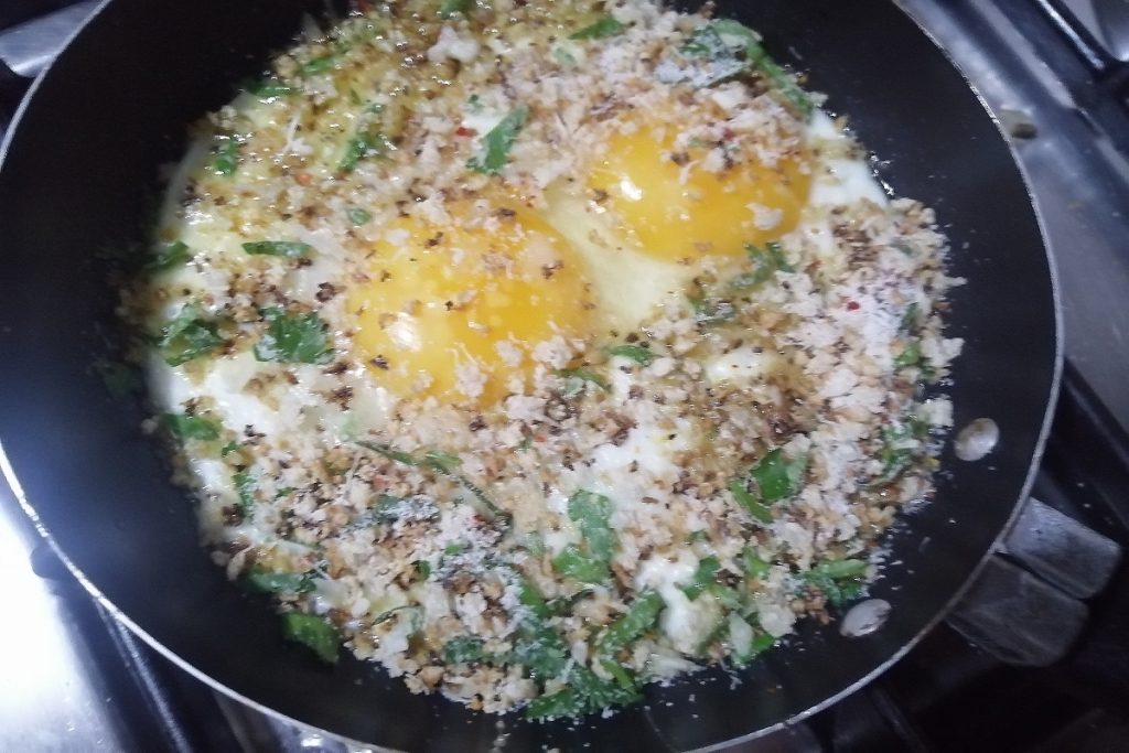 Los huevos a la carretero son huevos fritos enriquecidos con sabor gracias a la adición de pan tostado, pecorino, ajo, perejil y guindilla.
