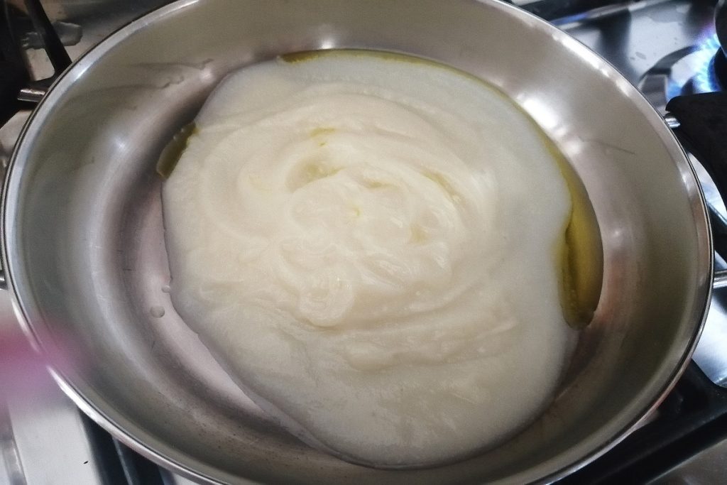 • Una vez limpia y hervida la coliflor, colócala en una batidora con un poco de agua de cocción y tritura hasta obtener una crema lisa y homogénea.