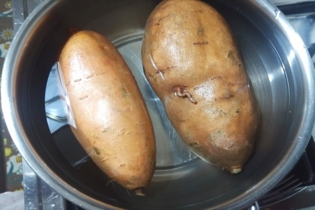 En una olla con agua ponemos las batatas y las cocinamos.