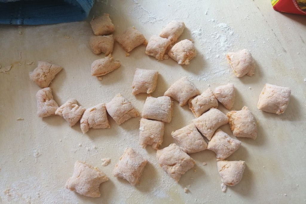 Cortamos en pequeños trozos de dos cm y los pasamos por el rizador de ñoquis.