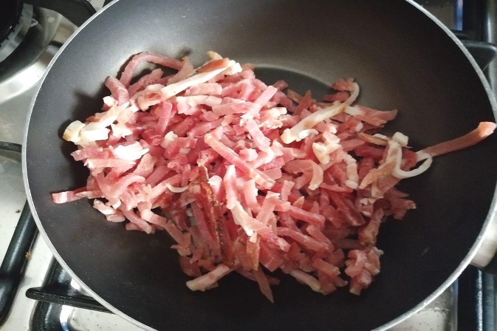 Colocamos el speck en una sartén antiadherente sin aceite y lo doramos.