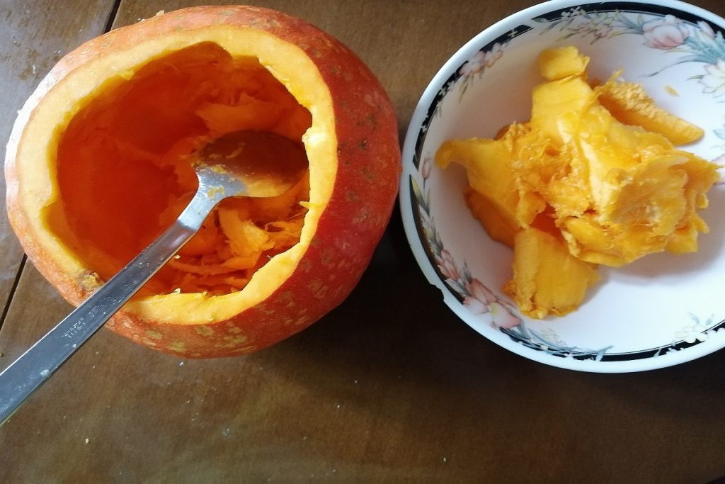 El plato se prepara con una primera cocción en el fogón para luego completar la cocción en el horno directamente en la calabaza vaciada.