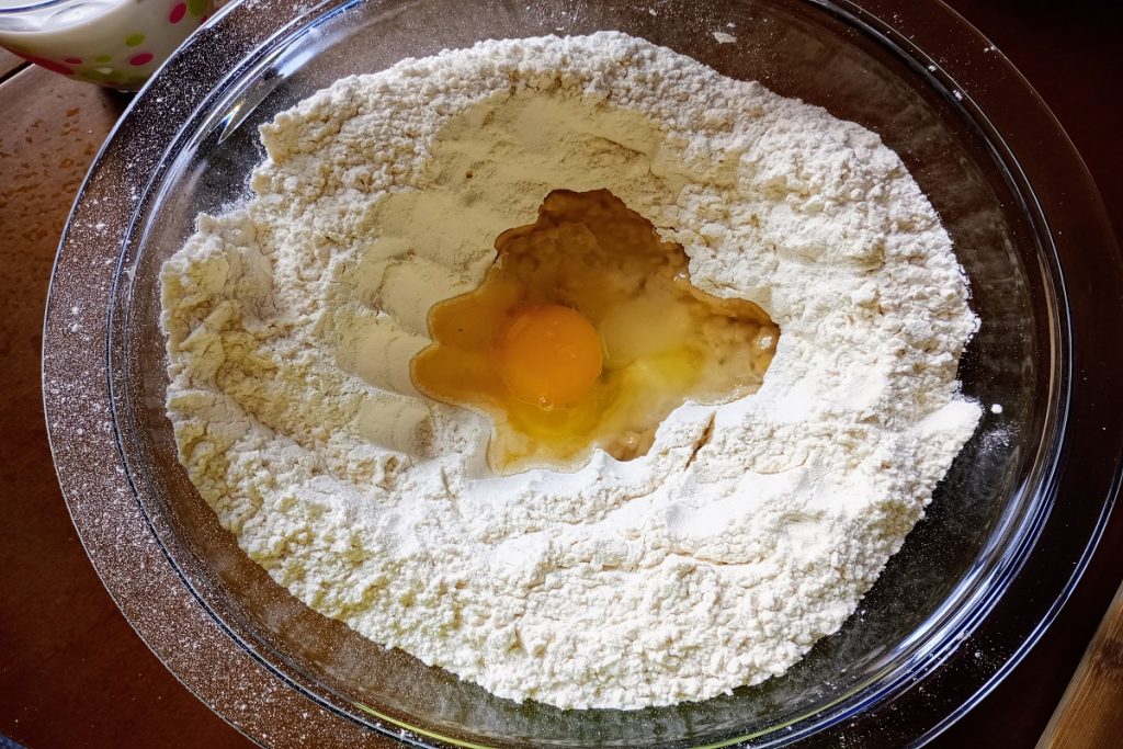 Mezclamos las dos harinas en un bol y añadimos el huevo, el aceite y la cucharadita de azúcar.