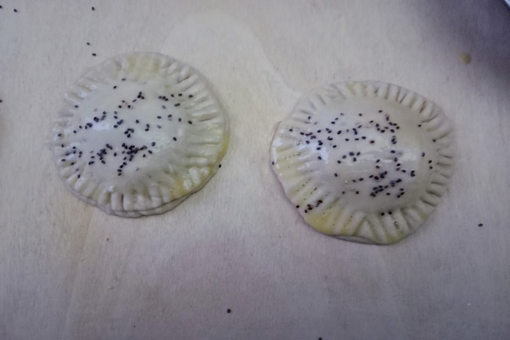 Con los dientes de un tenedor sellamos el círculo, pintamos con huevo batido y decoramos con las semillas de amapola.