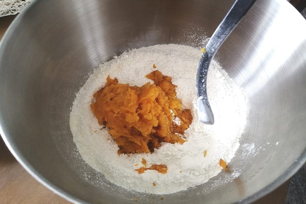 Vertemos la harina tamizada en el bol junto con la pulpa de calabaza, añadimos el aceite y la levadura disuelta en el agua.